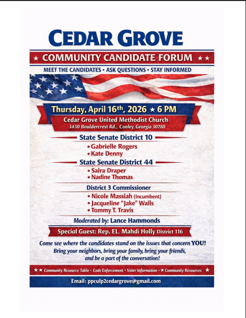 April 16 2026 Forum for Candidates to Represent South Dekalb will be held at at Cedar Grove United Methodist Church, 3430 Bouldercrest Rd., Conley, Georgia 30288 6PM. Moderated by Lance Hammonds.